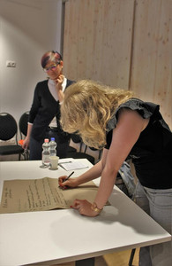 Ezután következett meghívott előadónk, Lajos Veronika, a Miskolci Egyetem Kulturális és Vizuális Antropológiai Tanszékének egyetemi docense „A moldvai csángó származású nők reprezentációja” nem mindennapi, work-shop jellegű interaktív foglalkozása, amelyben nekünk is aktívan részt kellett vennünk. Már a Veronika által előre meghatározott terem-berendezés se volt mindennapi; 4 asztalt és a székek oldalra helyezését kérte, minden asztalra egy-egy nagyméretű - a pár sorral lejjebb ismertetett kérdésekkel ellátott - papírlapot, írószerszámokkal egyetemben helyezett, amelyekre nekünk körbe-körbe járva kellett egyenként válaszolnunk, közben lazításképpen, halk zene szólt. A kérdések a következők:A moldvai csángó nők jellemzése; Üzenet az idősebb, 60-70-es moldvai csángó asszonyoktól a jövő generációinak; Rajzold le a teret, ahol a moldvai csángó nők időt töltenek; Üzenet a 20-as korosztályhoz tartozó csángó nőktől a jövő generációjának.